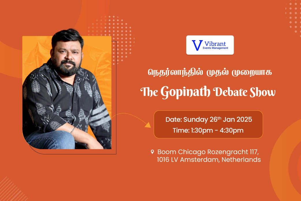Join Gopinath Chandran for a spirited Tamil talk show featuring lively debates, witty exchanges, and thought-provoking discussions. Choose your seating: Platinum, Gold, or Silver, and be part of an unforgettable afternoon.
